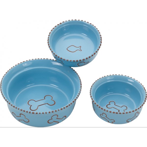 Terra Cotta Dog Dish / Size (7 in / Blue) Glazed terra cotta dish has a very distinctive look. Checkered terra cotta rim and terra cotta accents highlight this unique dish. Glazed terra cotta dish has a very distinctive look. Checkered terra cotta rim and terra cotta accents highlight this unique dish.: Size: 7 in.: Color: BLUE