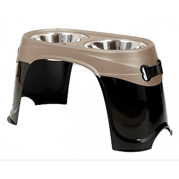 Easy Reach Pet DinerElevated feeder and waterer provides tall dogs with the benefit of eating and drinking from elevated bowls. Prevents stooping and associated discomfort. Easy-to-clean- removable stainless steel bowls included. Anti-rattle bumpers for bowl noise reduction. Elevated feeder and waterer provides tall dogs with the benefit of eating and drinking from elevated bowls. Prevents stooping and associated discomfort. Easy-to-clean- removable stainless steel bowls included. Anti-rattle bumpers for bowl noise reduction.: Color: BLACK PEARL TAN